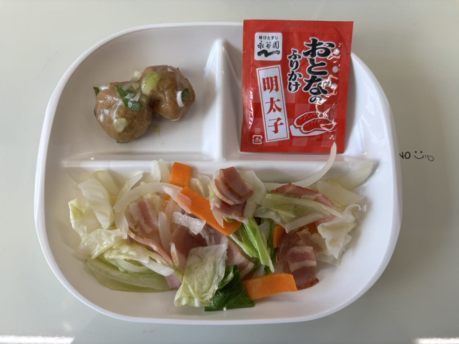 ・肉野菜炒め ・ミートボール ・ふりかけ ・ご飯 ・味噌汁