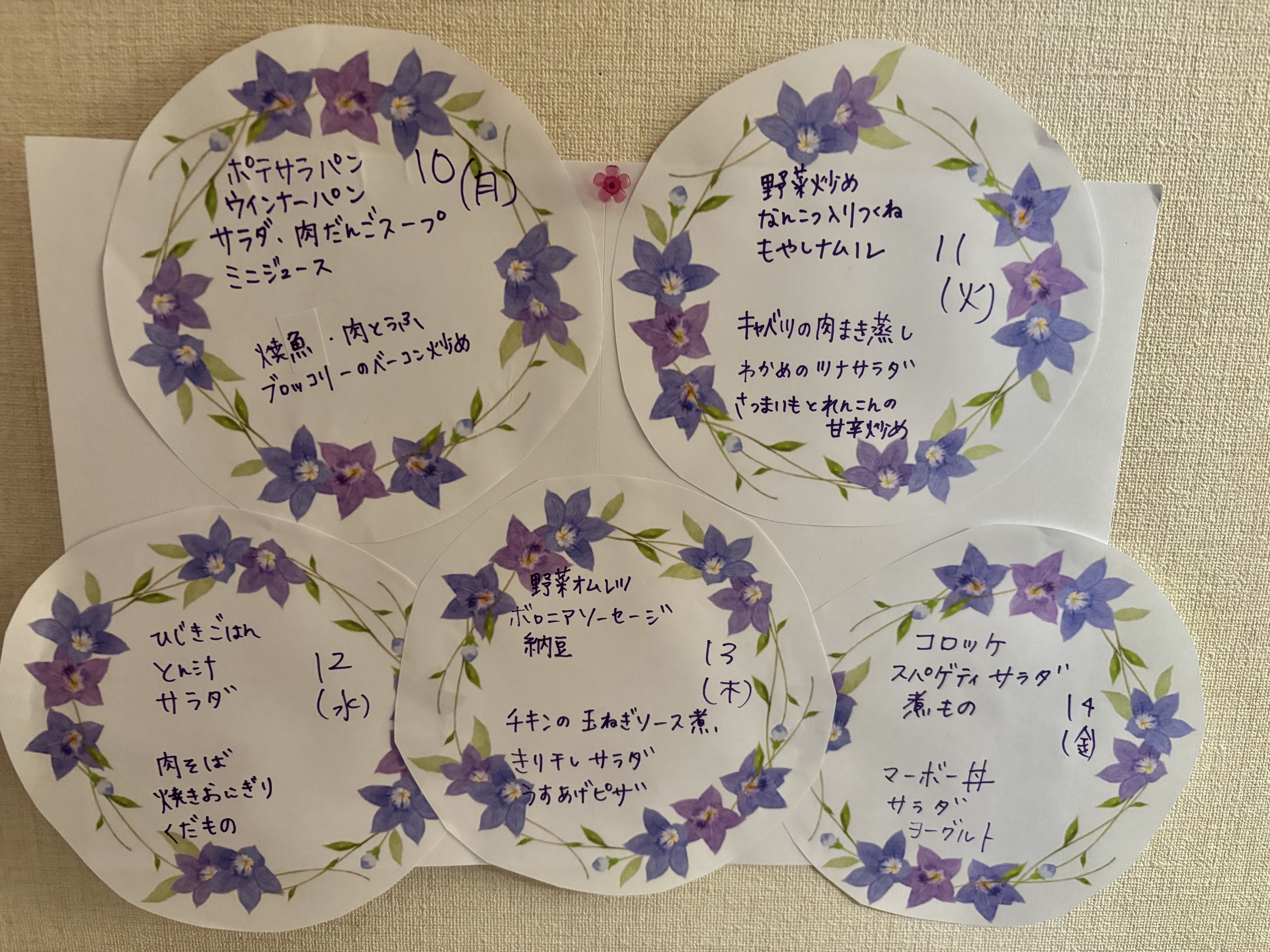 寮母さっちょん手づくり 今週のメニュー表はリンドウのお花😊