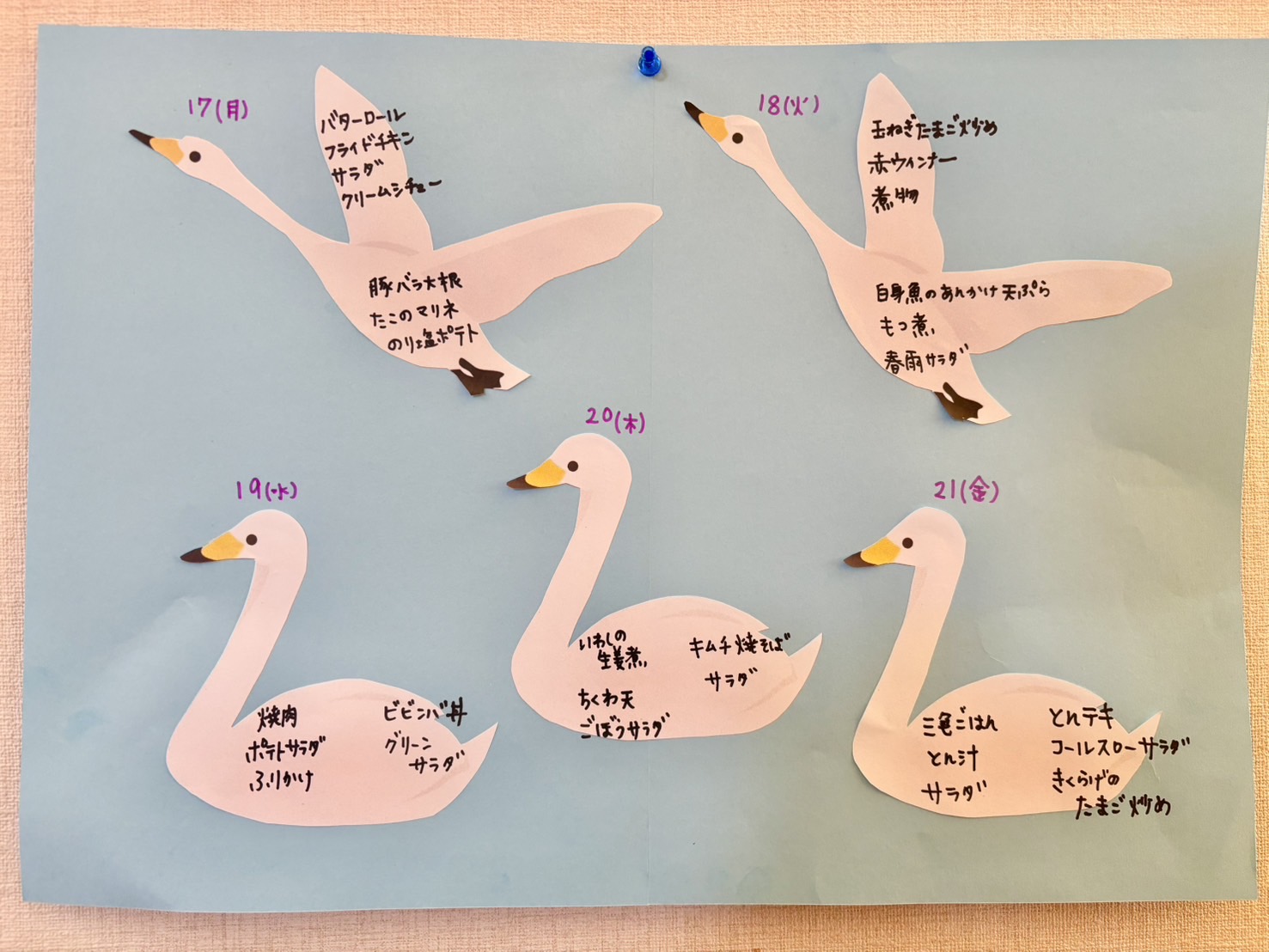 寮母さっちょん手づくり 今週のメニュー表は、白鳥さんが飛んでますね😊