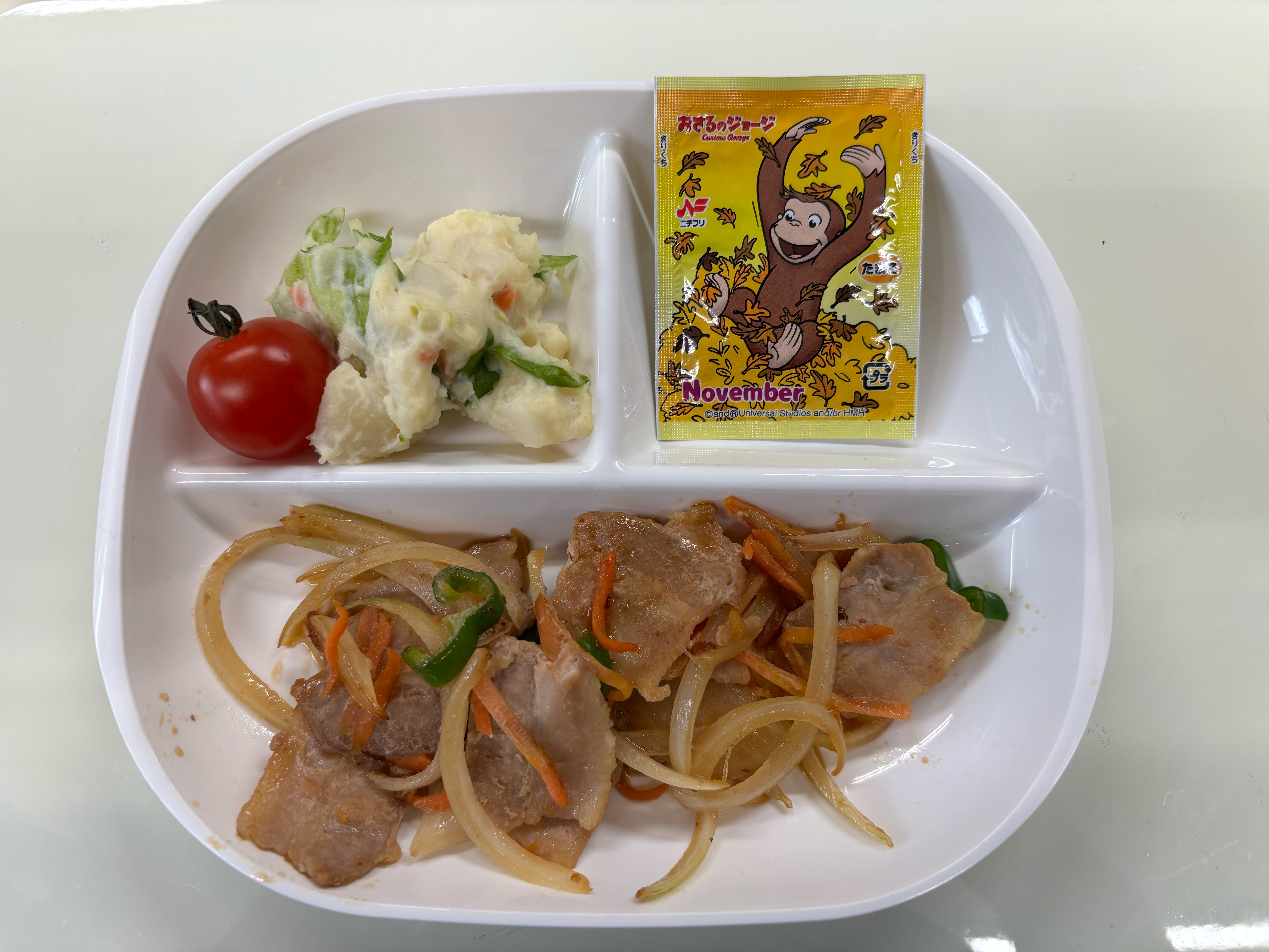 ・焼肉 ・ポテトサラダ ・ふりかけ ・ご飯 ・味噌汁