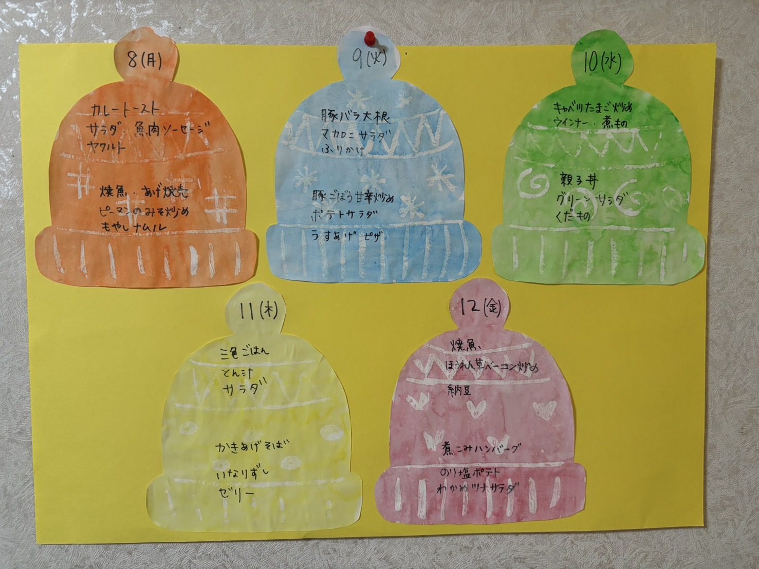 寮母さっちょん手づくり 今週のメニュー表は、カラフルな帽子ですね😊