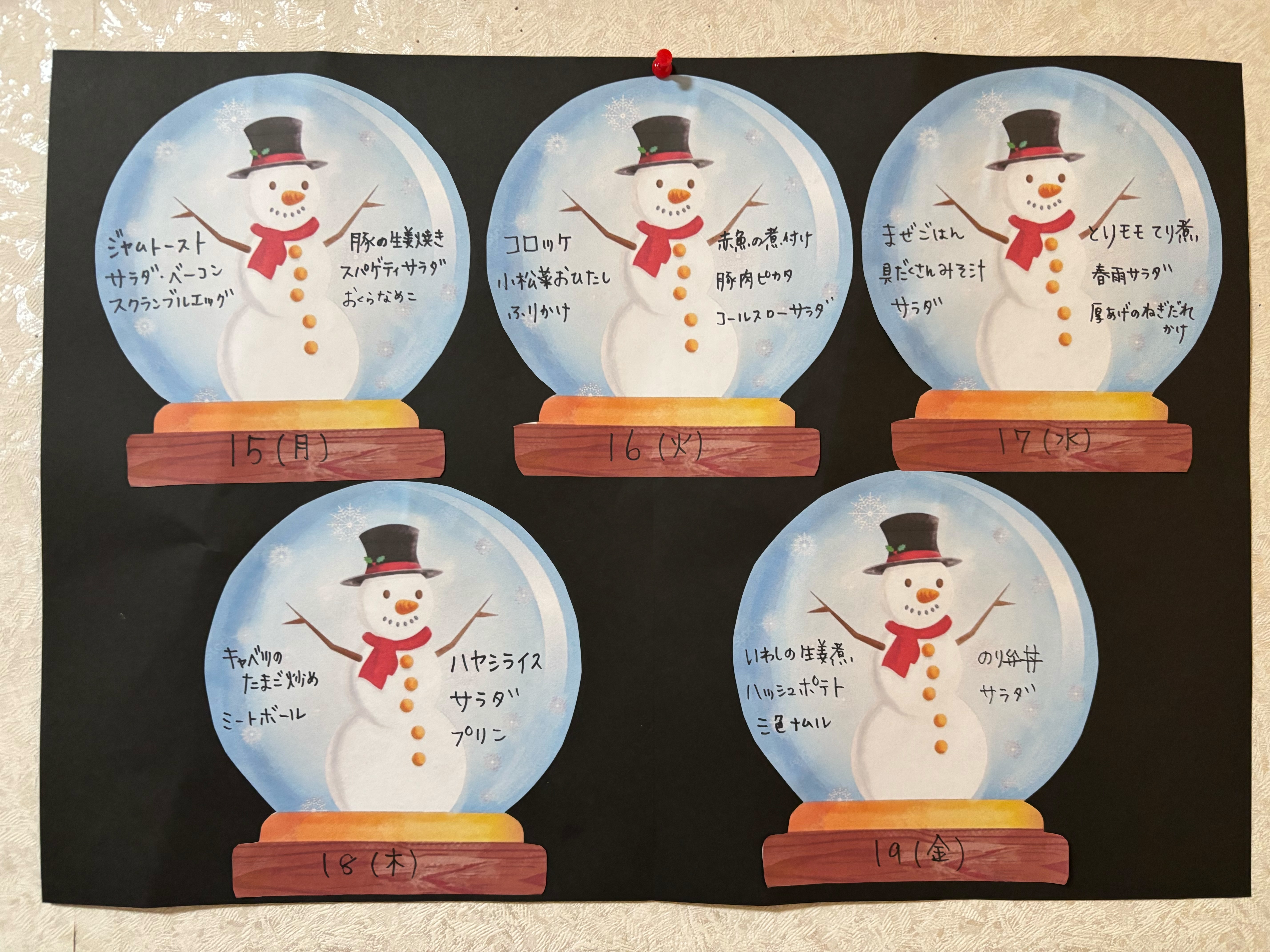 寮母さっちょん手づくり 今週のメニュー表は、 可愛い雪だるまのスノードーム🥰