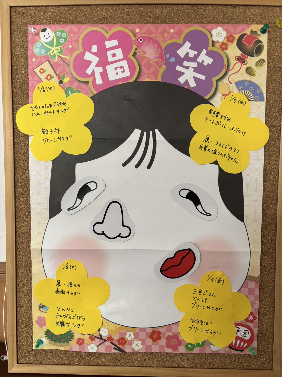 寮母さっちょん手づくりメニュー表、 2026年の第一弾は福笑いでスタート~