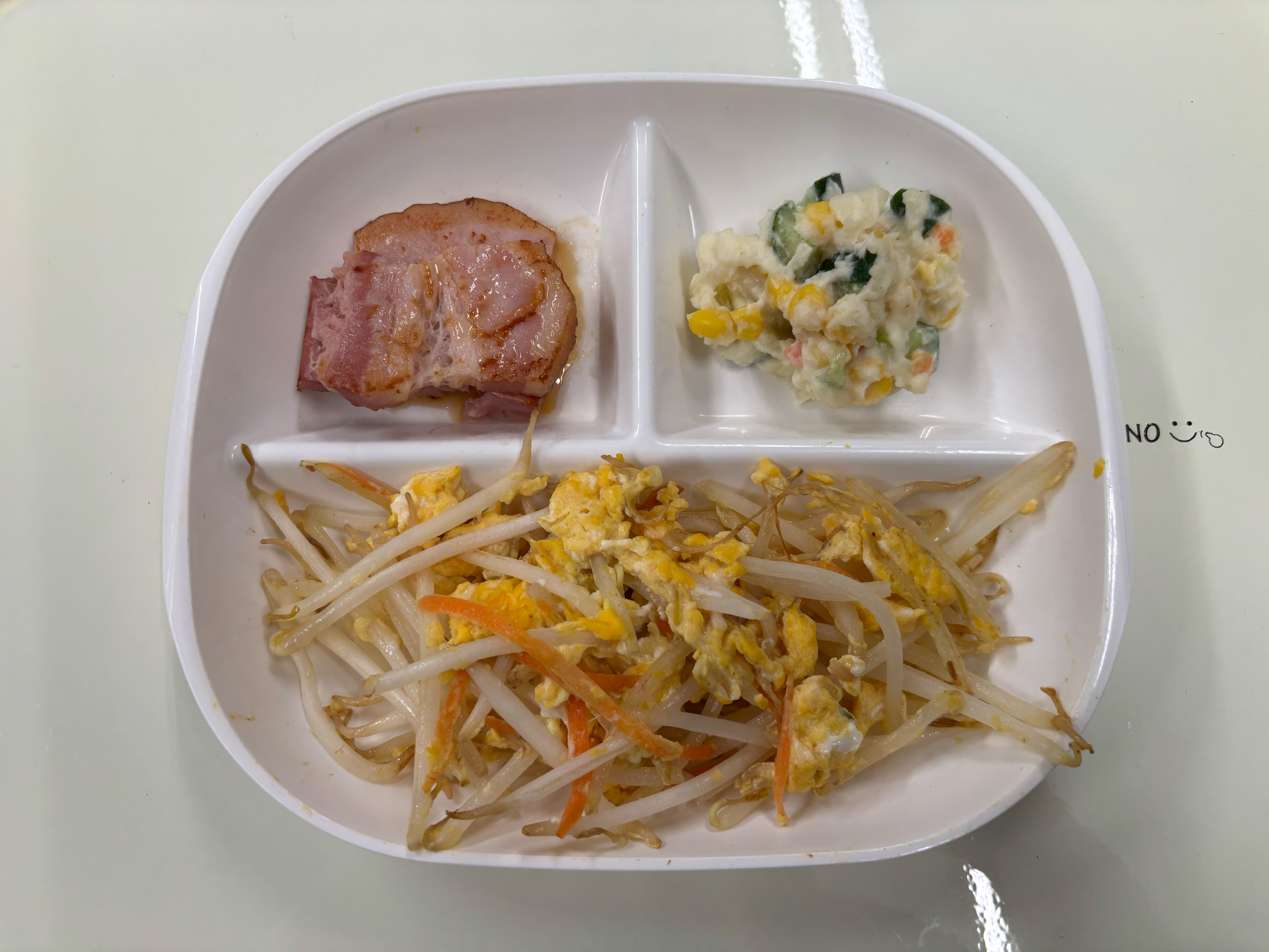 ・もやしのたまご炒め ・ハム ・ポテトサラダ ・ご飯 ・味噌汁