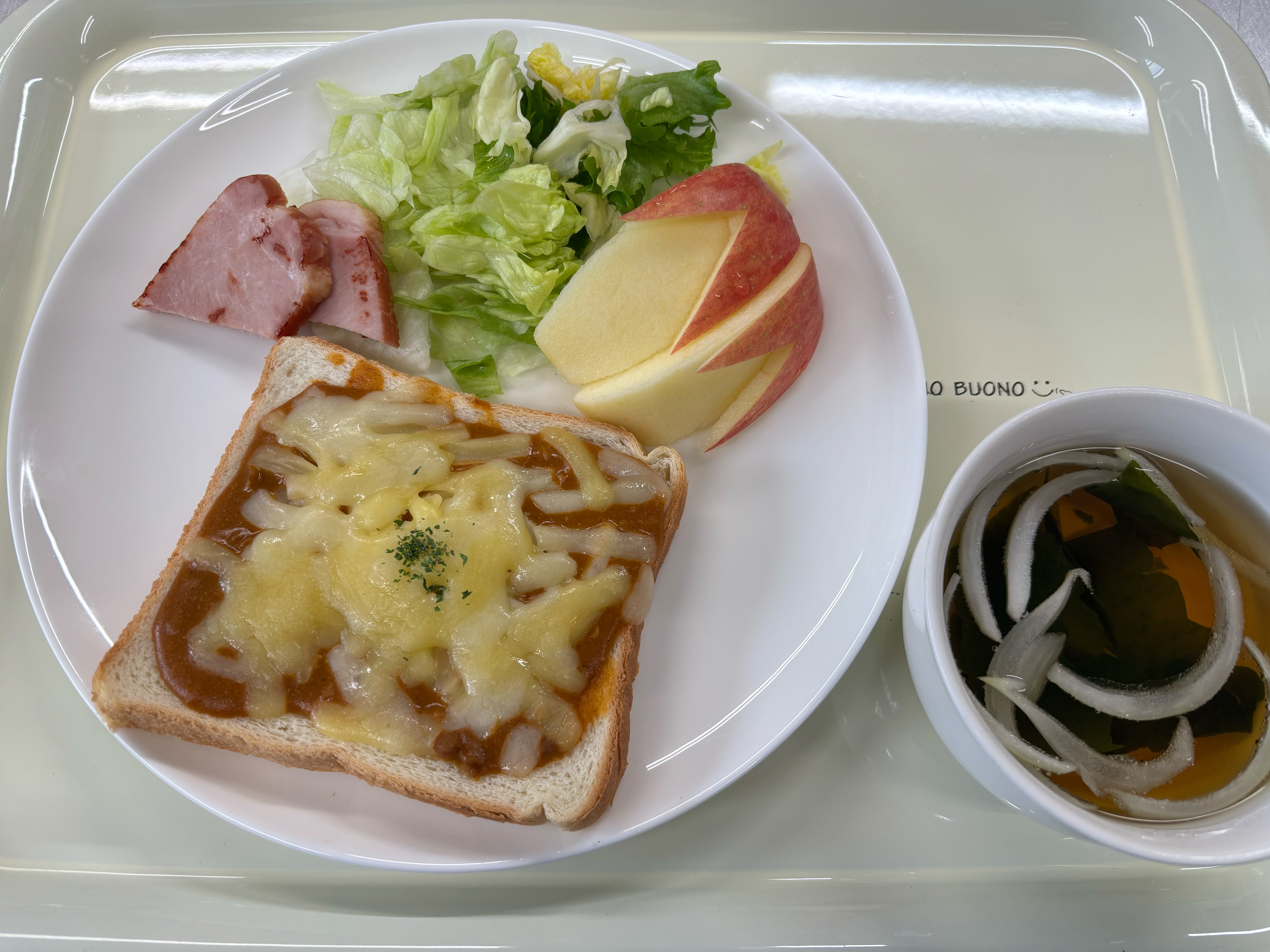 ・カレートースト ・サラダ ・ハム ・スープ ・りんご
