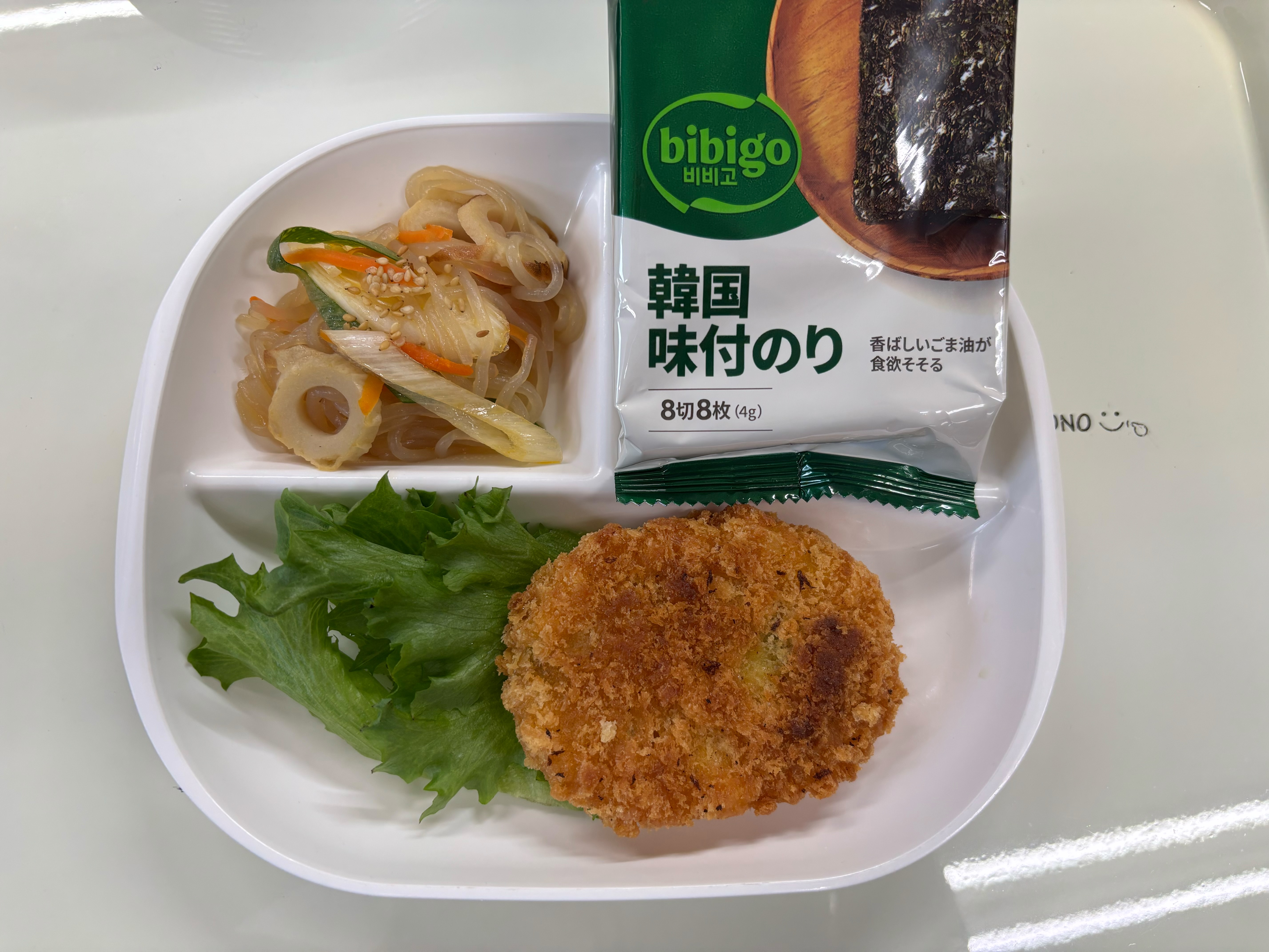 ・コロッケ ・こんにゃく甘辛炒め ・韓国のり ・ご飯 ・味噌汁