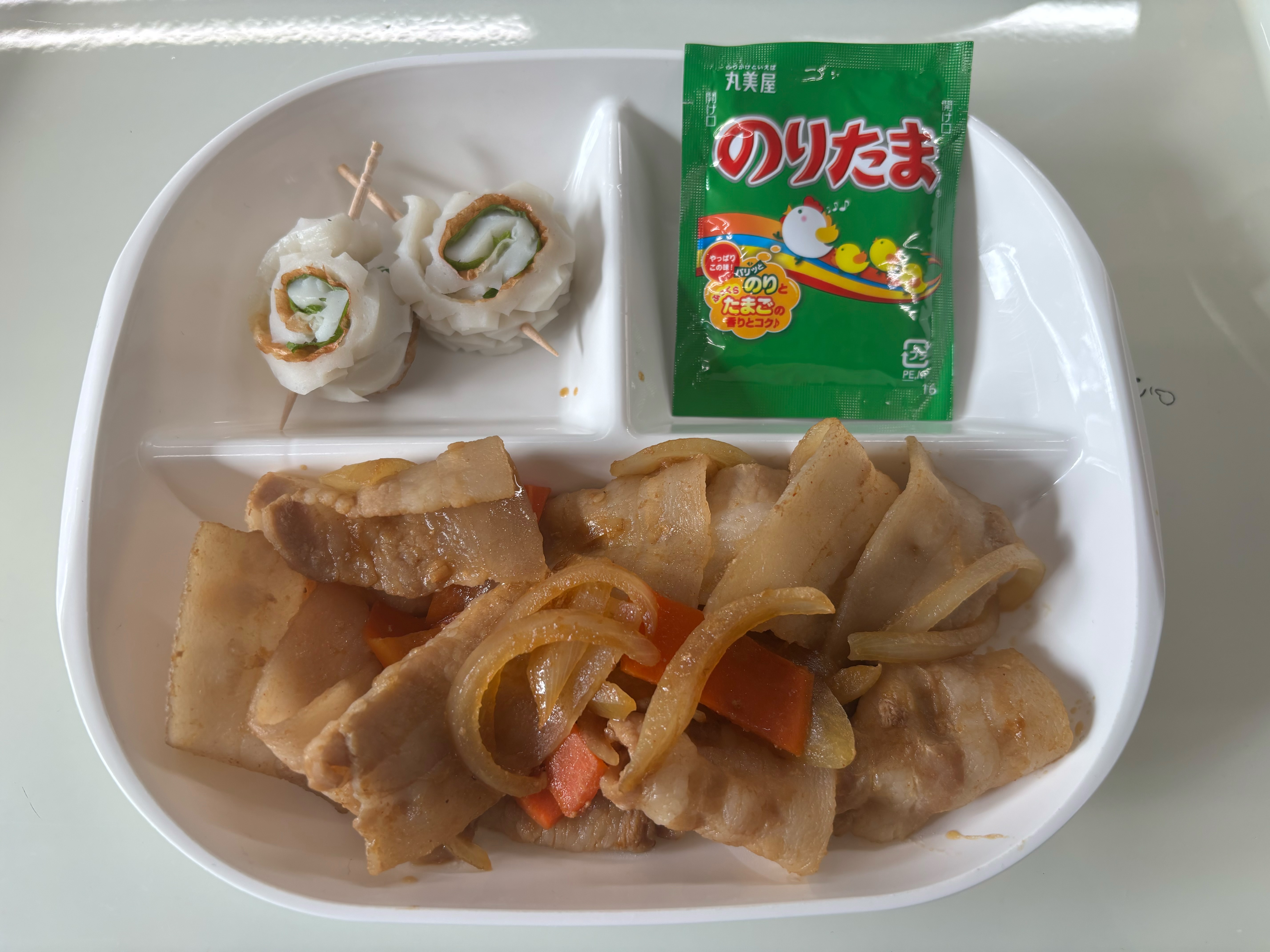 ・焼肉 ・くるくるちくわ ・ふりかけ ・ご飯 ・味噌汁