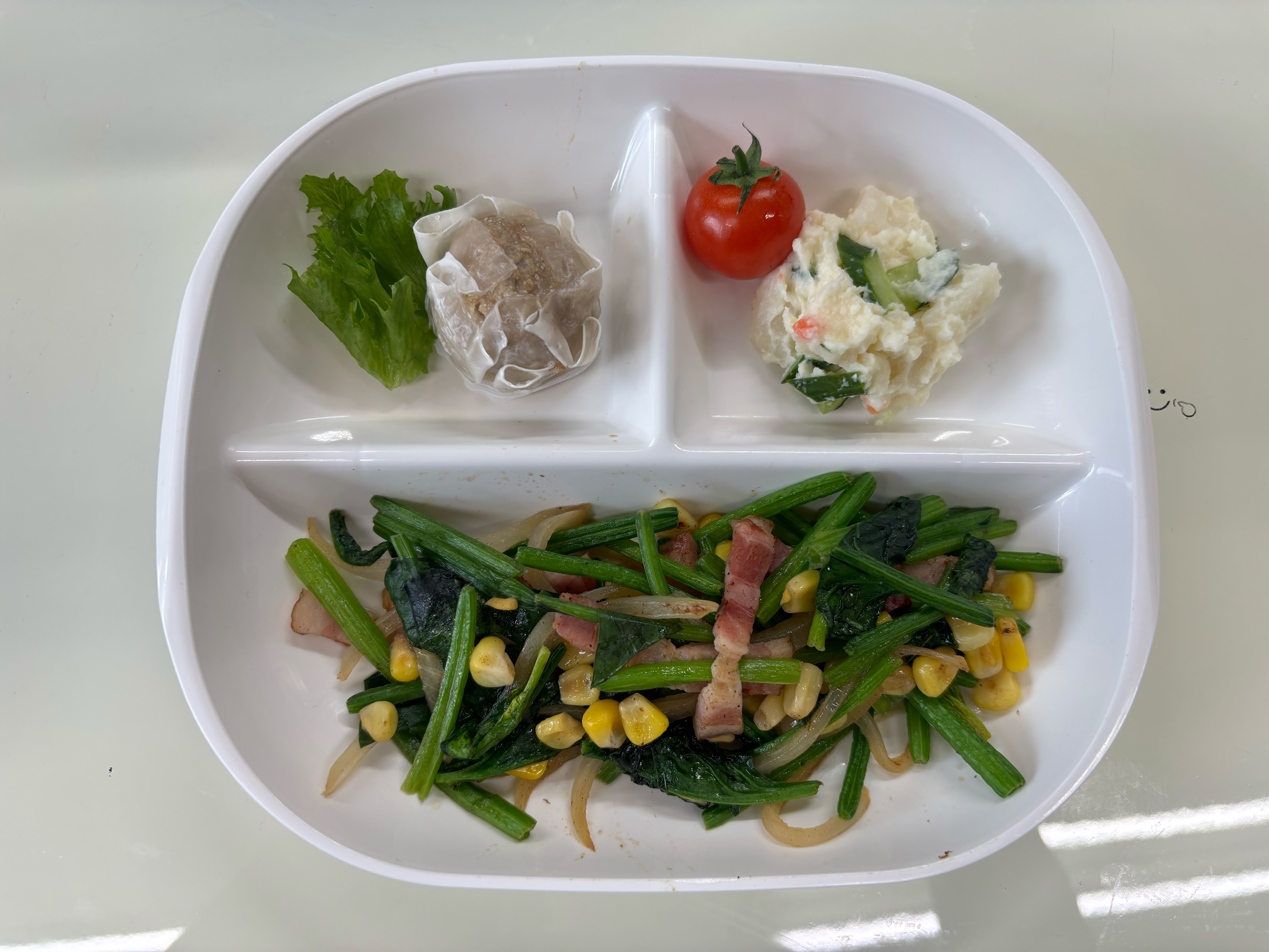 ・ほうれん草とベーコン炒め ・焼売 ・ポテトサラダ ・ご飯 ・味噌汁