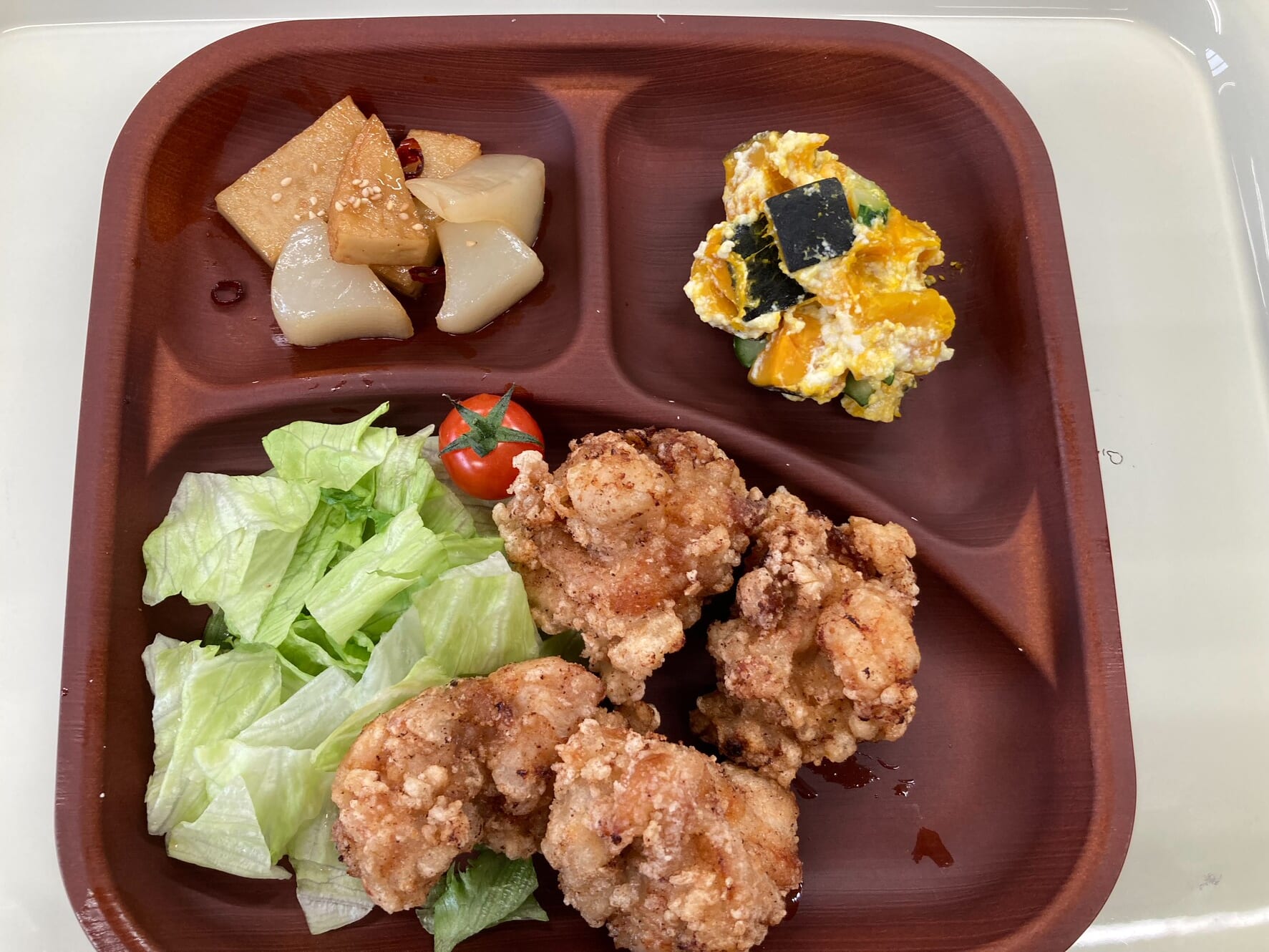 ・唐揚げ ・かぼちゃサラダ ・こんにゃくの甘辛炒め ・ご飯 ・味噌汁