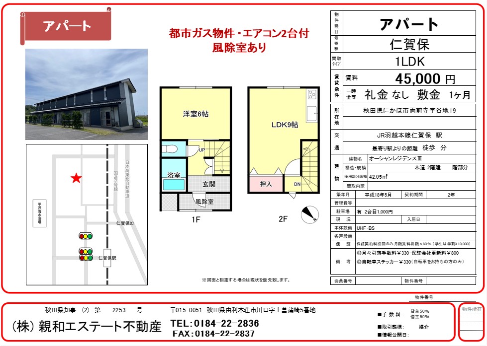 人気の1LDK・メゾネットタイプ・エアコン2台付き・風除室あり・都市ガス物件