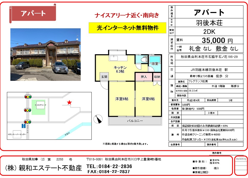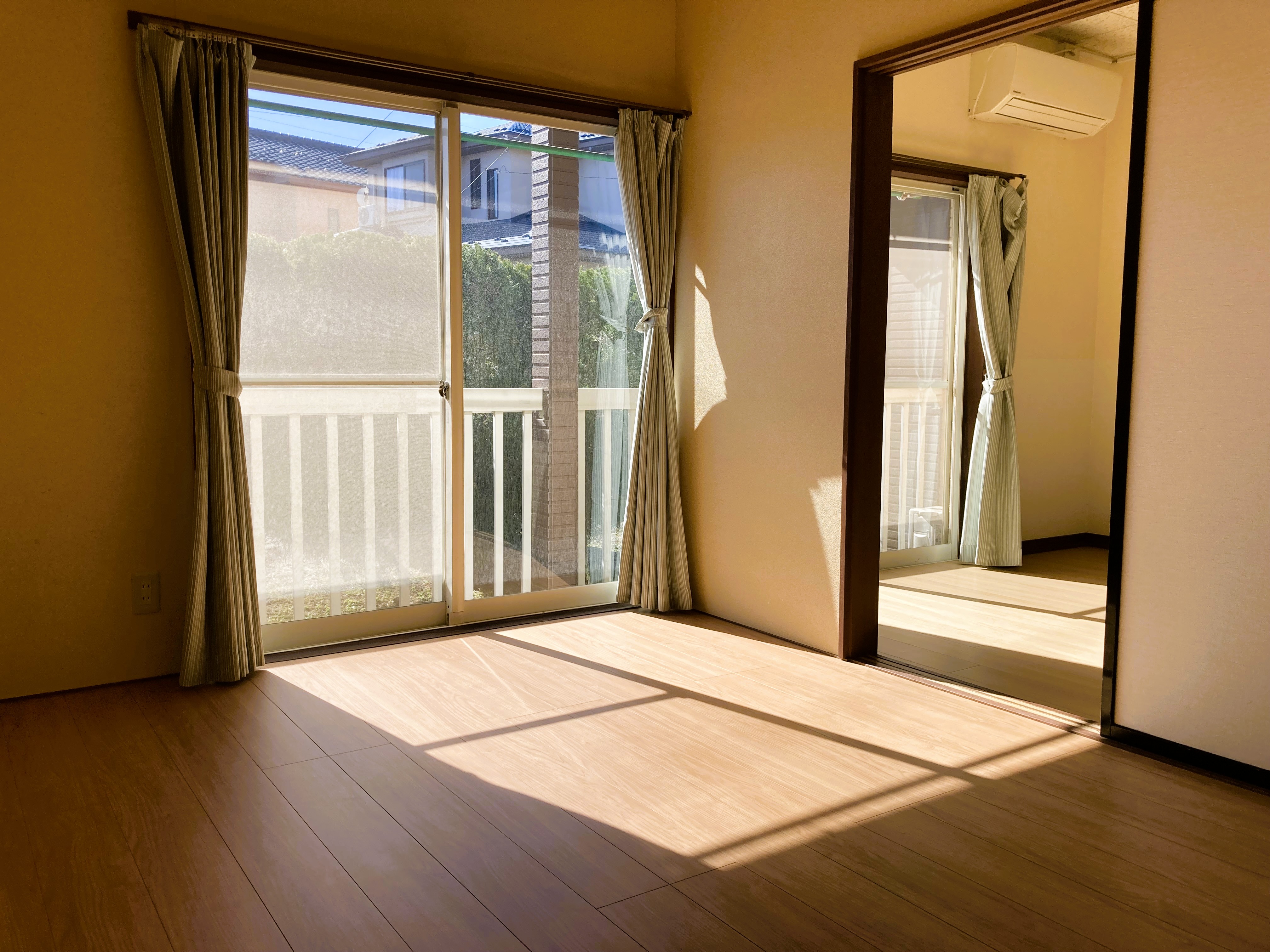- 2DK/洋間(6帖)、洋室(6帖)、DK(6.3帖)、トイレ、収納、浴室、ベランダ